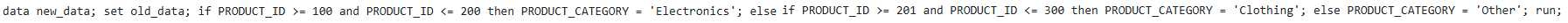 You have a dataset with a variable called 'PRODUCT ID' containing numeric values. You want to create a new variable called 'PRODUCT CATEGORY' based on the following logic: ' If 'PRODUCT_ID' is between 100 and 200, then 'PRODUCT CATEGORY' should be 'Electronics'. ' If 'PRODUCT is between 201 and 300, then 'PRODUCT CATEGORY' should be 'Clothing'. ' If 'PRODUCT ID' is outside these ranges, then 'PRODUCT CATEGORY' should be 'Other'. Which of the following SAS code snippets will correctly implement this logic?