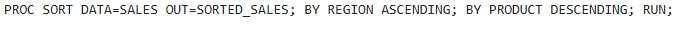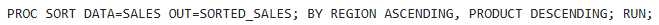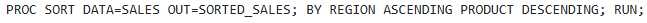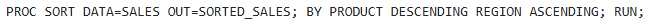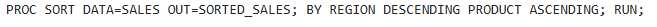 You have a dataset named 'SALES' with variables 'REGION', 'PRODUCT', and 'SALES AMOUNT'. You need to sort the data first by 'REGION' in ascending order and then by 'PRODUCT' in descending order, creating a new dataset named 'SORTED SALES'. Which PROC SORT statement would achieve this?