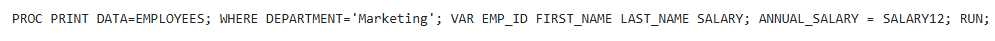 You have a dataset 'EMPLOYEES' with variables 'EMP ID', 'FIRST NAME', 'LAST NAME', 'SALARY', and 'DEPARTMENT'. You need to create a report that displays 'EMP D', 'FIRST NAME', 'LAST NAME', and 'SALARY' for employees in the 'Marketing' department. Additionally, you want to display a calculated variable 'ANNUAL SALARY' representing the employee's salary multiplied by 12. Which PROC PRINT statement accomplishes this?