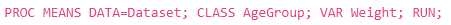 You need to generate a report showing the median and standard deviation of a variable 'Weight' for different age groups (under 18, 18-30, 30-50, 50+). Which of the following PROC MEANS statements would you use?