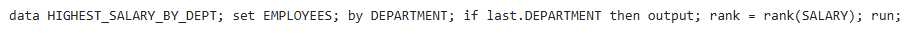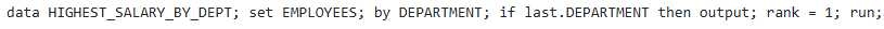 You have a dataset 'EMPLOYEES' with variables 'EMPLOYEE ID', 'DEPARTMENT', and 'SALARY'. You want to create a new dataset 'HIGHEST SALARY BY DEPT' that contains the highest salary for each department. However, you also need to create a variable called 'RANK' that indicates the rank of each employee's salary within their department, with the highest salary being ranked 1. Which of the following DATA step code snippets will achieve this correctly?