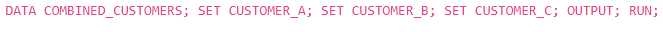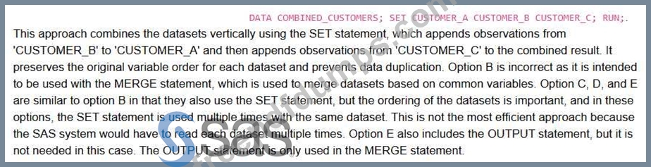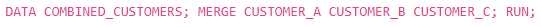 You are working on a project that involves analyzing customer data from multiple sources. You have three SAS datasets: 'CUSTOMER A', 'CUSTOMER B', and 'CUSTOMER C. Each dataset has different variables and potentially different observation counts. You want to create a single dataset called 'COMBINED CUSTOMERS' that includes all the observations from the three datasets, regardless of their structure. Which of the following options would achieve this, ensuring no data duplication and maintaining the original variable order for each dataset?