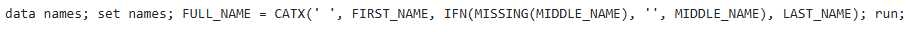 You need to create a new variable 'FULL NAME' by concatenating the values from variables 'FIRST NAME', 'MIDDLE NAME', and 'LAST NAME', separated by a space. However, the 'MIDDLE NAME' variable might be missing for some observations. Your code should handle this scenario by only including the 'MIDDLE NAME' if it is not missing. Which code snippet accomplishes this task using the 'CAT X' function?
