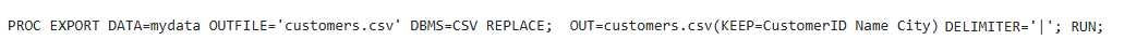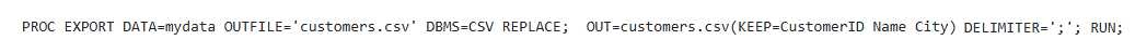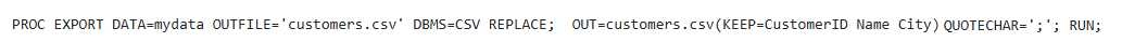 You have a SAS dataset named 'mydata' containing customer information, and you need to export it to a CSV file named 'customers.csv'. You want to include only the 'CustomerlD', 'Name', and 'City' variables in the output file and ensure that the data is delimited by a semicolon (;). Which PROC EXPORT statement accomplishes this task?