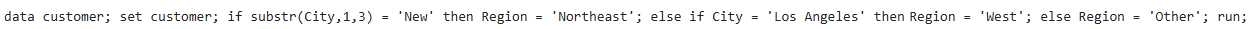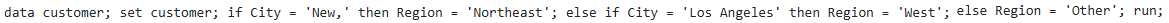 You have a dataset 'CUSTOMER' with variables 'CustomerlD', 'Name', and 'City'. You want to create a new variable 'Region' based on the 'City' variable using the following rules: If 'City' starts with 'New', then 'Region' = 'Northeast'; If 'City' is 'Los Angeles', then 'Region' = 'West'; otherwise, 'Region' = 'Other'. Which code snippet correctly implements this logic in the DATA step?