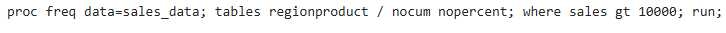 You have a dataset 'sales_data' with variables 'Region', 'Product', and 'Sales'. You want to create a frequencyreport that displays the frequency counts for each region and product combination, but you only want to see the counts for those combinations where the sales value is greater than $10,000. How would you modify the PROC FREQ statement to achieve this?