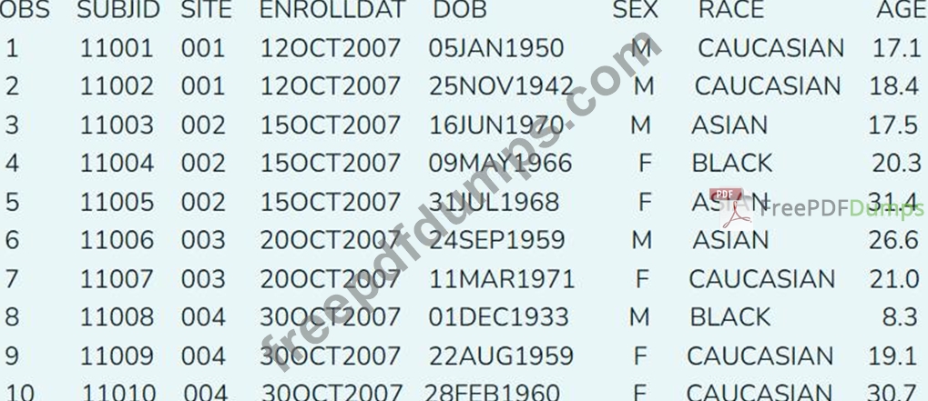Given the following demography (DM) data set sorted by site with character variables SUBJID, SITE, SEX, RACE and numeric variables ENROLLDAT and DOB: