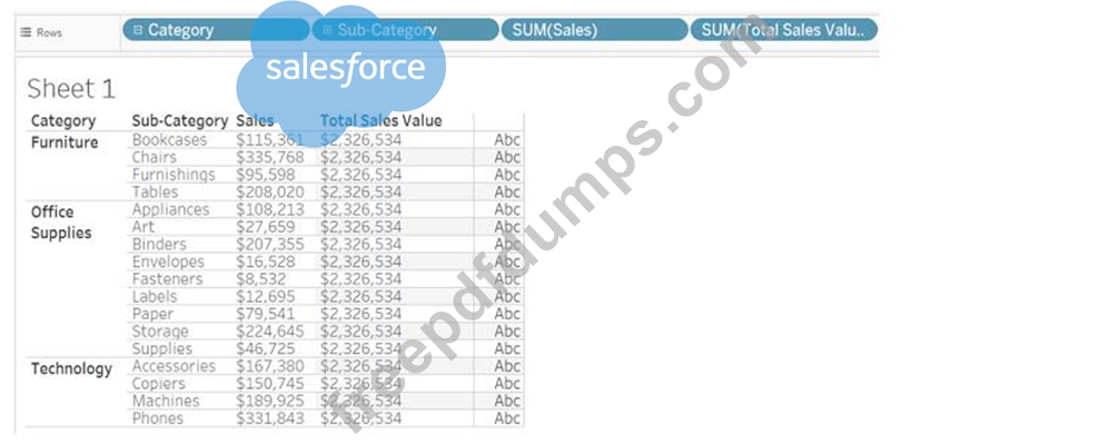 Which method will produce the output for the Total Sales Value field for all the categories shown in the table?