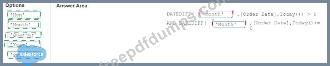 How should you complete the formula for Exclude Current Month? (Drag the appropriate Options to the Answer Area and drop into the correct locations.)