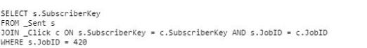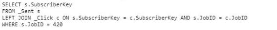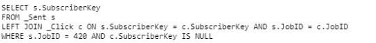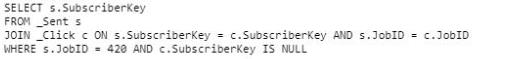 A developer needs to identify all subscribers who were sent Job ID 420 but did not click any links. Which SQL statement would produce the desired results?