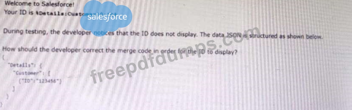 A developer is creating an OmniScript that provisions trail orgs to their customers. The following text block in the Omniscript uses a merge code to display the ID for the new trail org:
