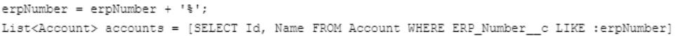 Universal Containers uses a custom Lightning page to provide a mechanism to perform a step-by-step wizard search for Accounts. One of the steps in the wizard is to allow the user to input text into a text field, ERP_Number__c, that is then used in a query to find matching Accounts.