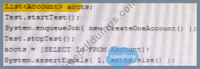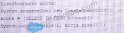 Assuming the CreateOneAccount class creates one account and implements the Queuetable interface, which syntax tests the Apex code?