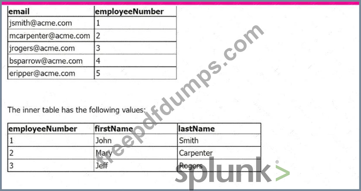 The line of SPL used to join the tables is: | join employeeNumber type=outer How many rows are returned in the new table?