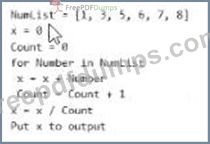 * Initialize two variables: x and Count to zero. * Iterate through each number in the NumList. * For each number in the list: * Add the number to x. * Increment Count by one. * After processing all numbers in the list, calculate the average: * Average = x / Count. The NumList contains the following integers: [1, 3, 5, 6, 7, 8]. Calculating the average: (1 + 3 + 5 + 6 + 7 + 8) / 6 = 30 / 6 = 5.0. However, none of the provided options match this result. It seems there might be an error in either the options or the calculation.